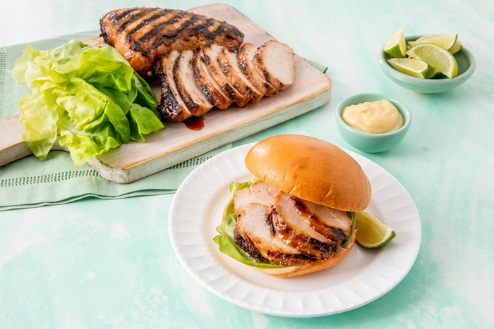 Heat a cast-iron grill pan over medium heat. Place turkey on pan, and lightly cover with foil. Cook, turning occasionally, until golden and nice grill marks have formed, and instant-read thermometer inserted into thickest portion registers 165°F, about 20 minutes. Let stand for at least 5 minutes before slicing. Serve on buns with miso mayonnaise and lettuce.
